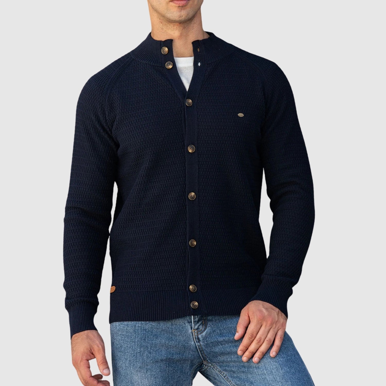Tento kardigan kombinuje střízlivost klasického designu s jemností vysoce kvalitní bavlny. Jeho pletená tkanina poskytuje teplo, aniž by ztrácela prodyšnost, zatímco strukturovaný střih a elegantní knoflíky z něj dělají ideální kousek pro rafinované a pohodlné outfity. Perfektní do práce, na neformální večeře nebo stylové chladné dny.