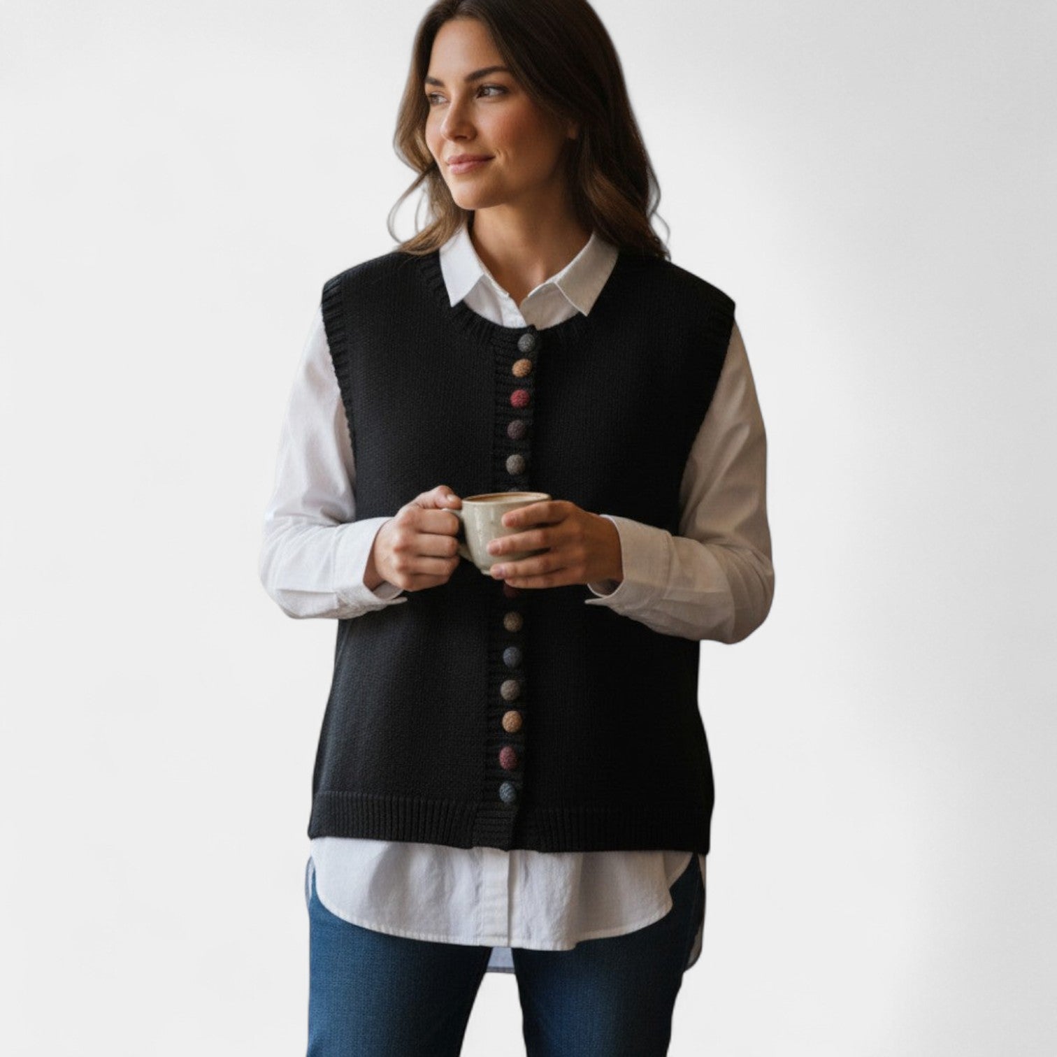 Pletená vesta Karmen je dokonalým spojením pohodlí a elegance. Díky svému nadčasovému designu a všestrannému střihu se stane oblíbeným kouskem vašeho šatníku – ideální pro vrstvení přes košili, šaty nebo tričko. Skvěle se hodí pro práci, volný čas i večerní setkání.