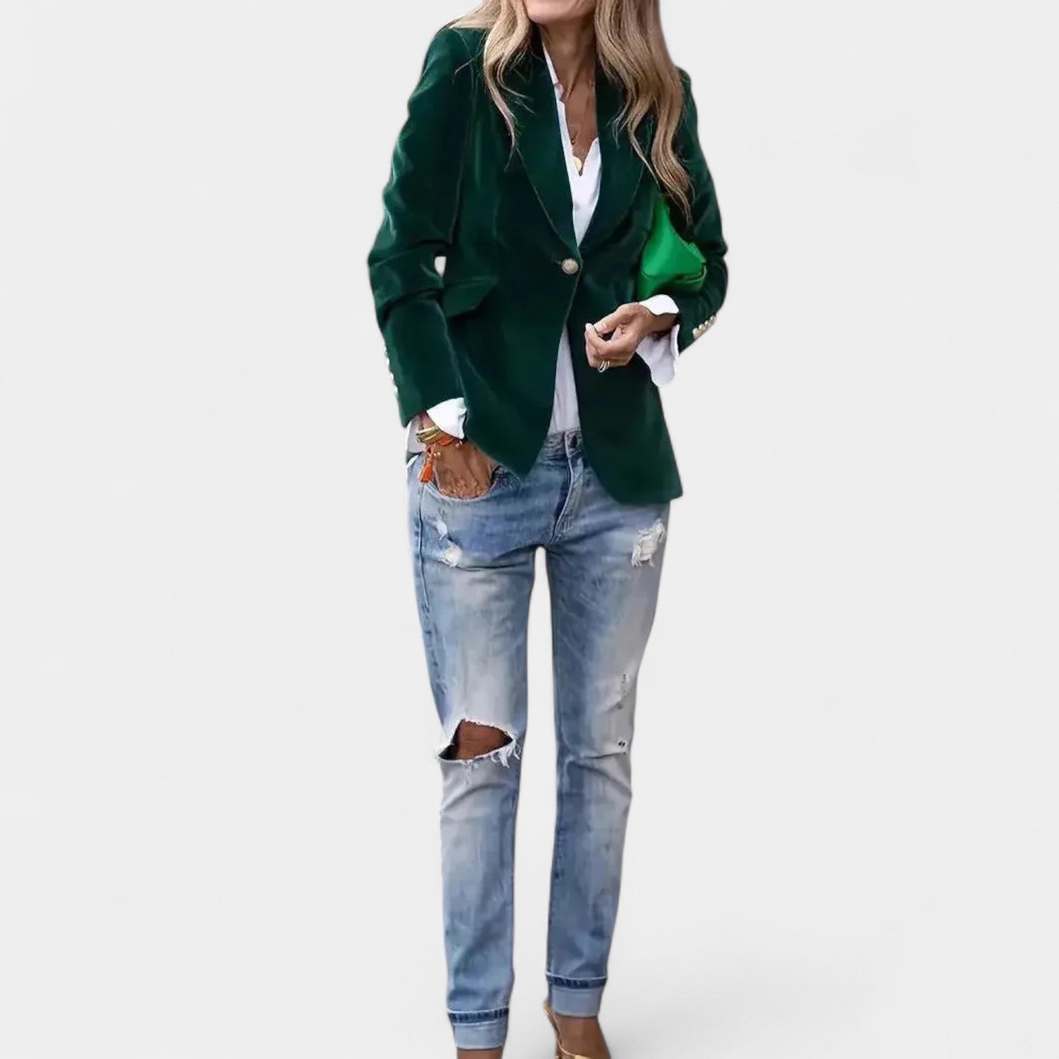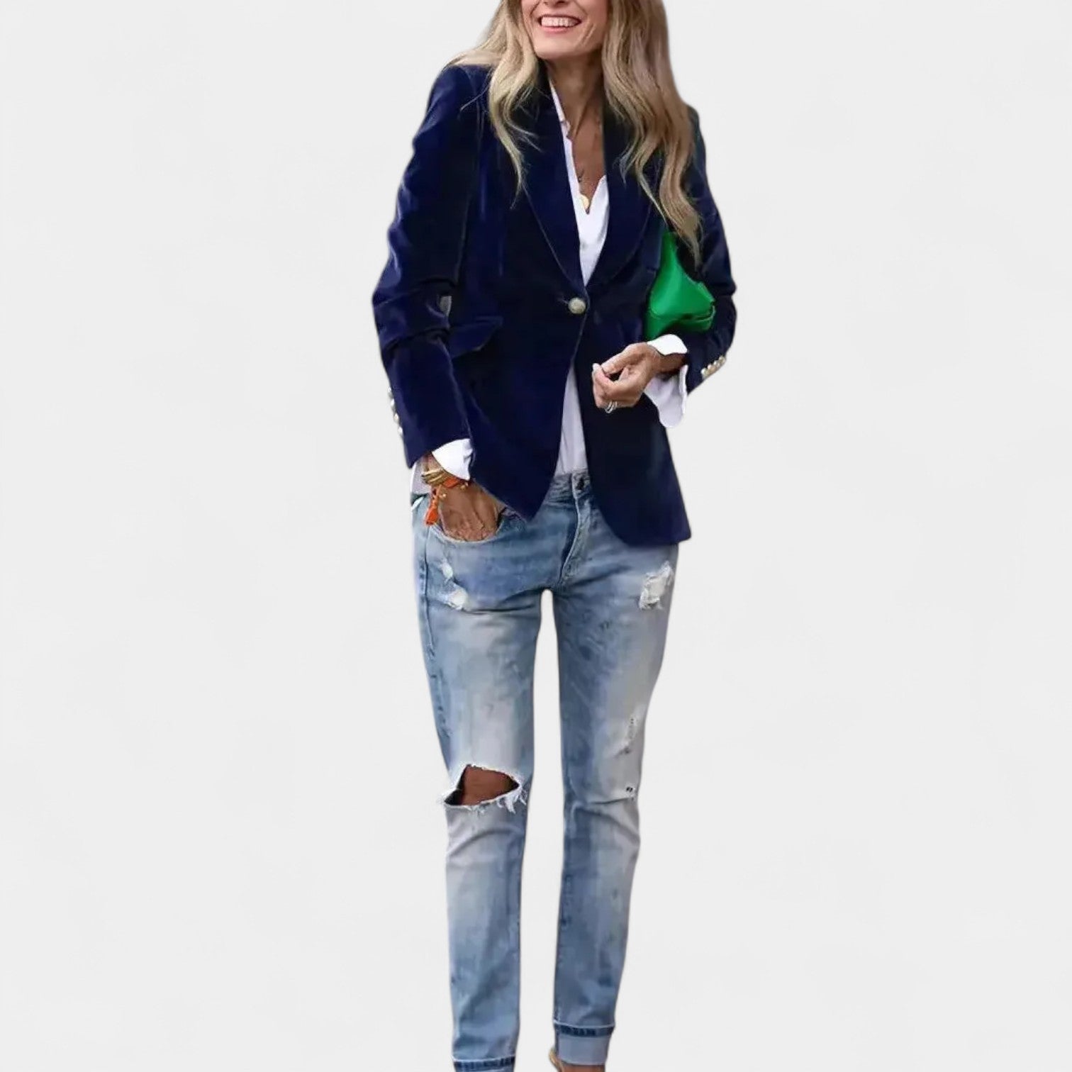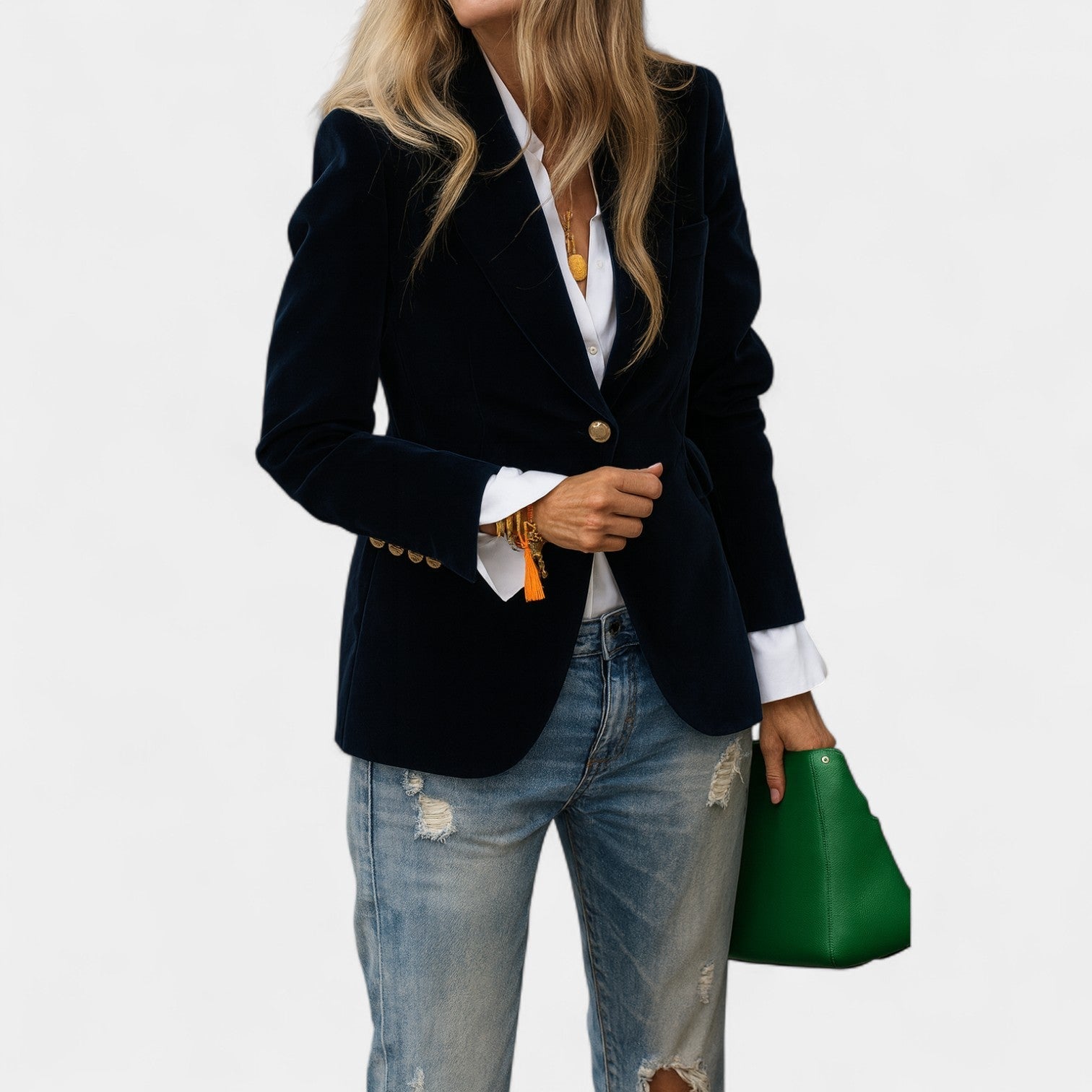 Sako Andrea s jemným sametovým povrchem je dokonalým kouskem pro ženy, které chtějí působit elegantně a sebevědomě v každé situaci. Díky preciznímu střihu s jednořadým zapínáním, ostrým klopám a jemně vyztuženým ramenům vytváří lichotivou siluetu, která se hodí jak k džínům, tak i k elegantnějším outfitům. Zlaté knoflíčky na rukávech dodávají celku sofistikovaný detail.