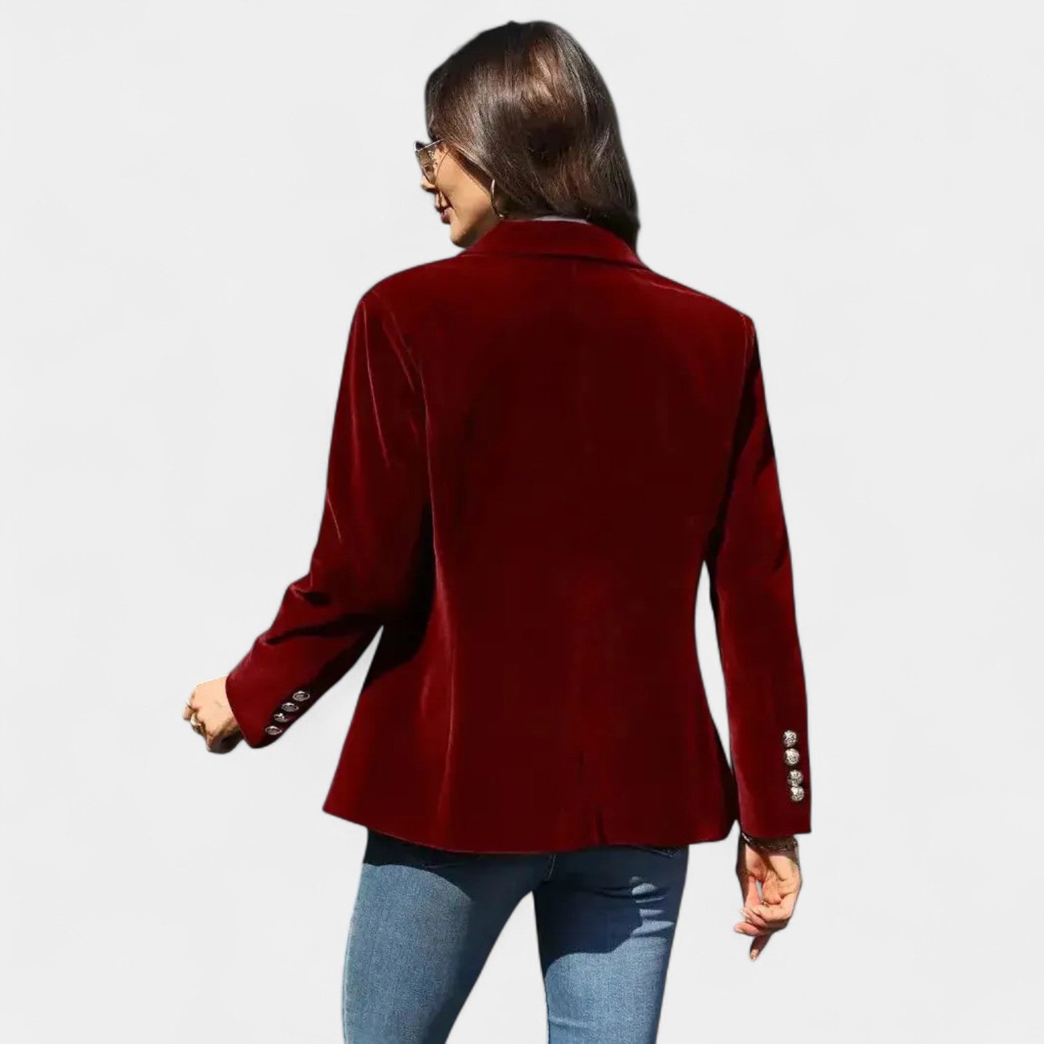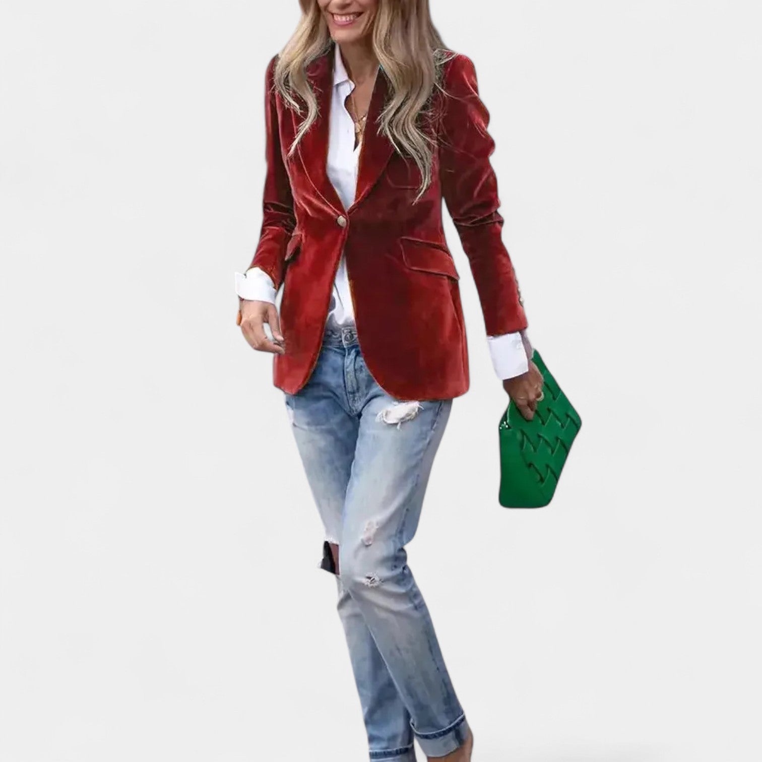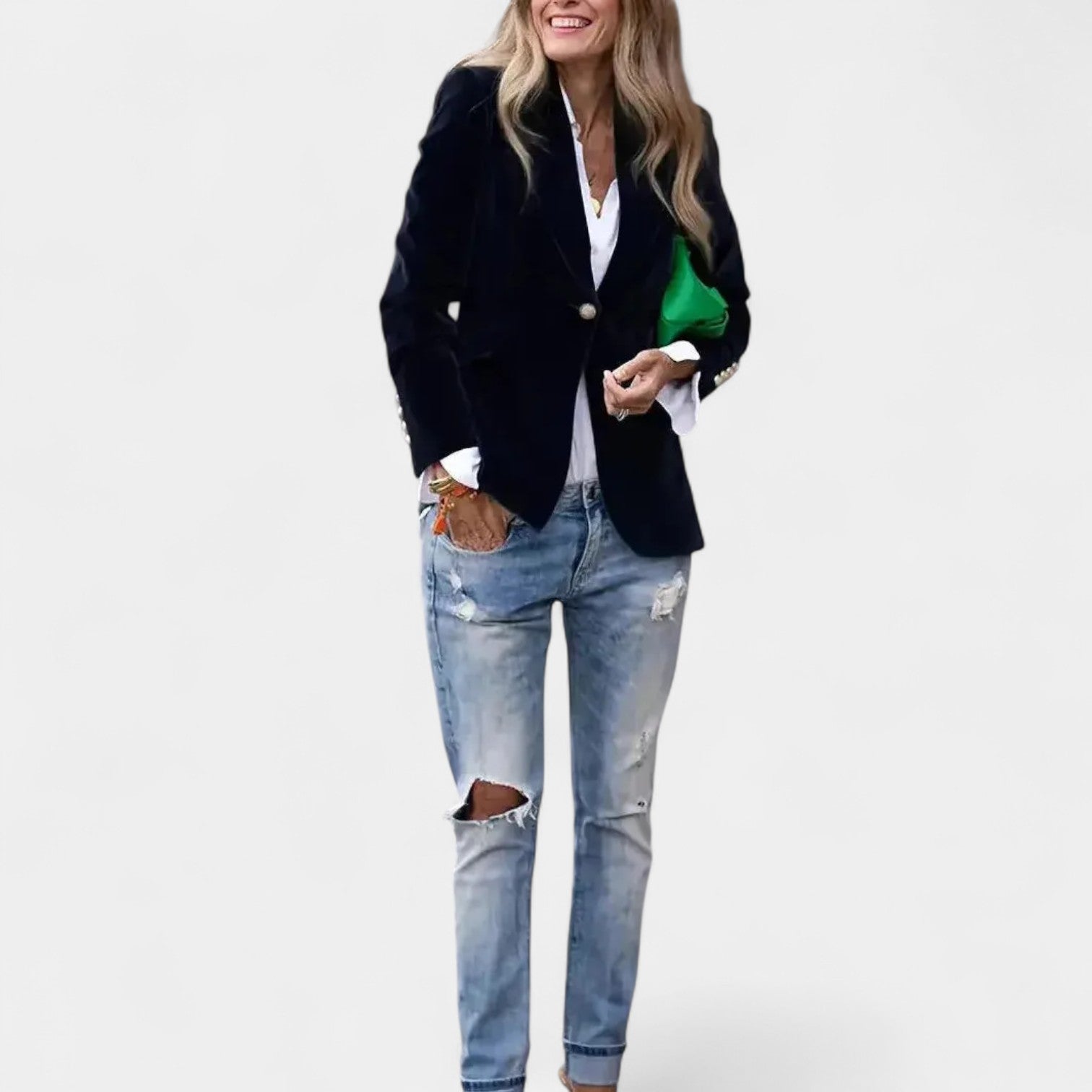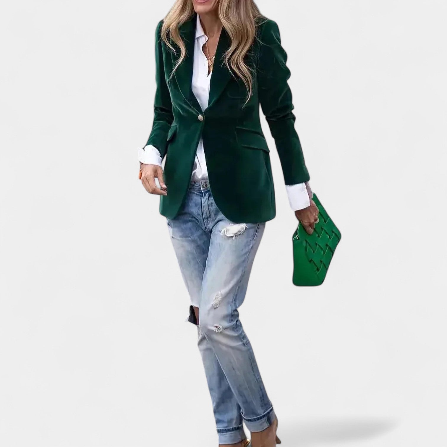 Sako Andrea s jemným sametovým povrchem je dokonalým kouskem pro ženy, které chtějí působit elegantně a sebevědomě v každé situaci. Díky preciznímu střihu s jednořadým zapínáním, ostrým klopám a jemně vyztuženým ramenům vytváří lichotivou siluetu, která se hodí jak k džínům, tak i k elegantnějším outfitům. Zlaté knoflíčky na rukávech dodávají celku sofistikovaný detail.